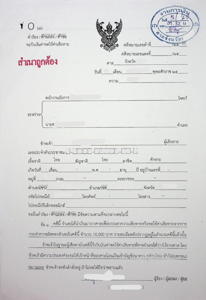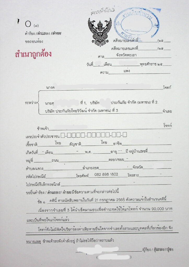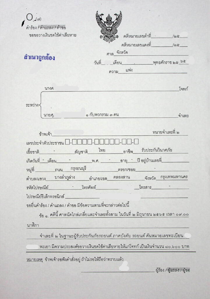 ข้อเท็จจริงและเอกสารที่อ้างอิงในบทความนี้ เป็นคดีที่เกิดขึ้นจริงและมีการฟ้องร้องกันจนปัจจุบันคดีได้ถึงที่สุดแล้วทั้งทางแพ่งและทางอาญา และลูกความซึ่งเป็นฝ่ายผู้บาดเจ็บก็ได้รับการชดใช้ค่าเสียหายตามจำนวนเงินที่ตกลงกันได้จากผู้ขับขี่ฝ่ายผิดและบริษัทประกันครบถ้วนแล้ว ซึ่งคดีนี้ทีมงานทนายความของเราได้รับการติดต่อเพื่อขอคำปรึกษาและให้เข้าช่วยดำเนินการทางคดีภายหลังจากผู้บาดเจ็บเคยเข้าเจรจาค่าเสียหายในชั้นพนักงานสอบสวนกับผู้ขับขี่ฝ่ายผิดและบริษัทประกันมาแล้วครั้งหนึ่ง โดยเห็นว่าค่าเสียหายที่บริษัทประกันเสนอให้ จำนวน 5,000 บาท นั้น ไม่เหมาะสมกับความเสียหายที่เกิดขึ้น จึงแต่งตั้งให้ทีมทนายความให้ดำเนินการฟ้องร้องผู้ขับขี่รถยนต์ที่เป็นฝ่ายประมาทและบริษัทผู้รับประกันภัยรถยนต์ให้รับผิดชดใช้ค่าสินไหมทดแทนในชั้นศาล
